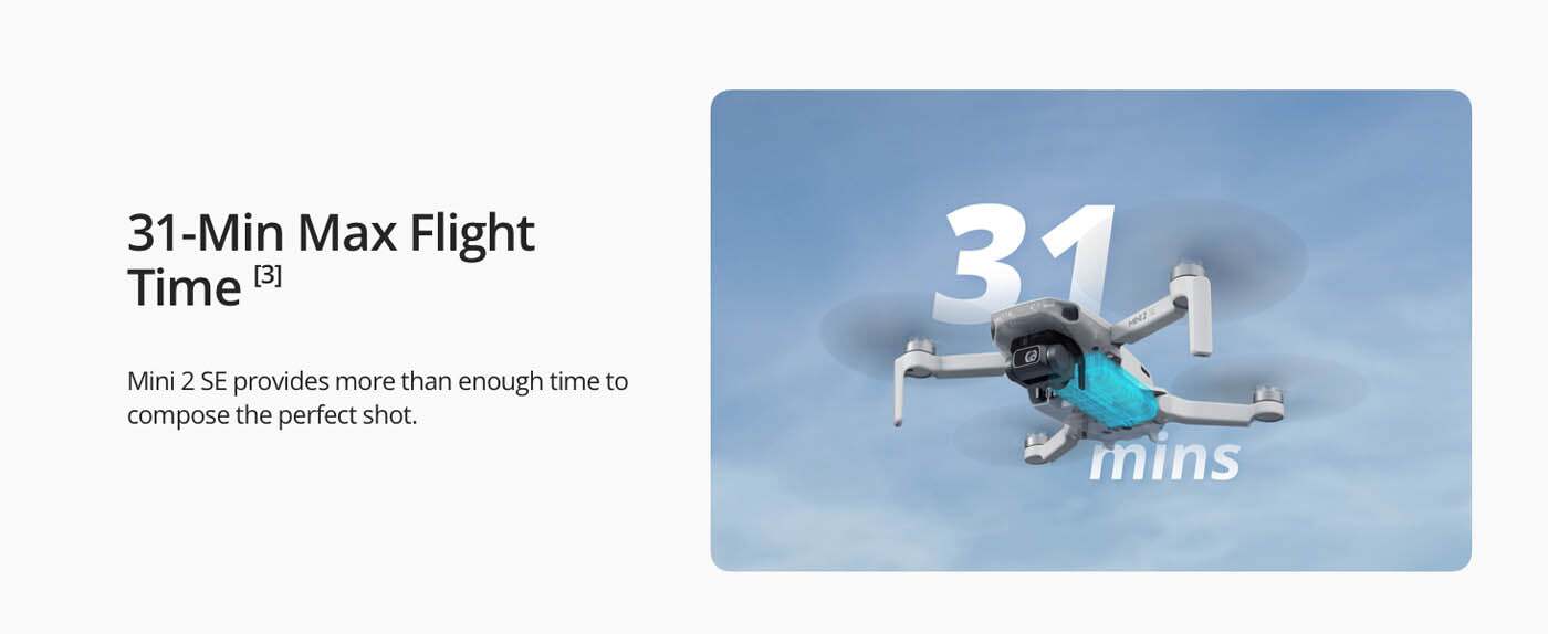 With a max battery life of 31 minutes, Mini 2 SE grants more than enough time to compose the perfect shot.