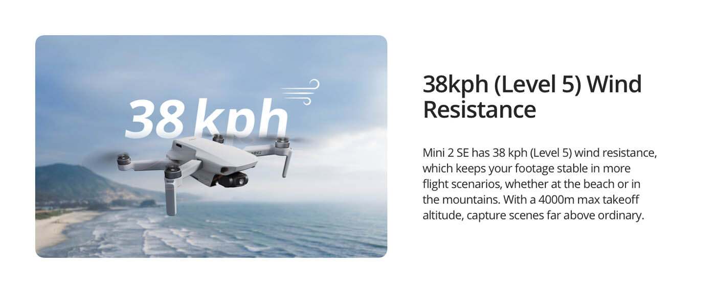 Mini 2 SE flies steady and reliably and keeps your footage stable even when flying in environments with level-5 winds, up to 38kph.