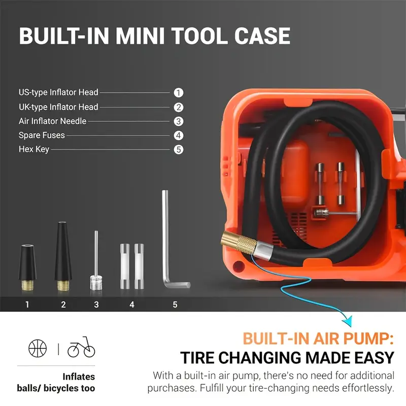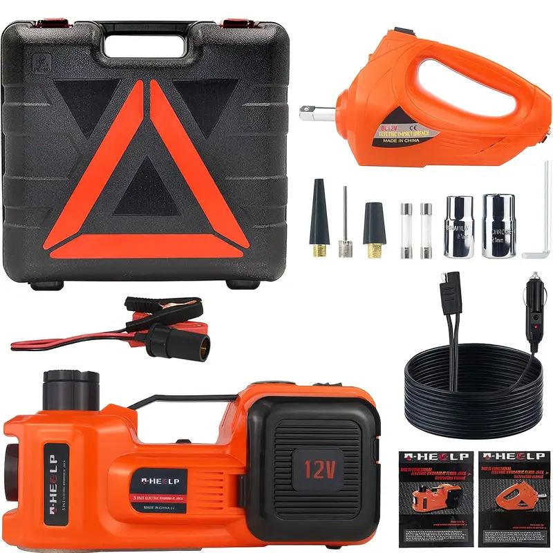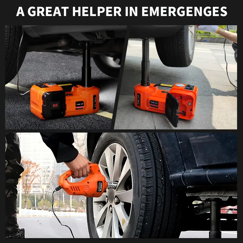 🔧 3-in-1 Multifunction Kit – Includes electric jack, inflator pump & LED light