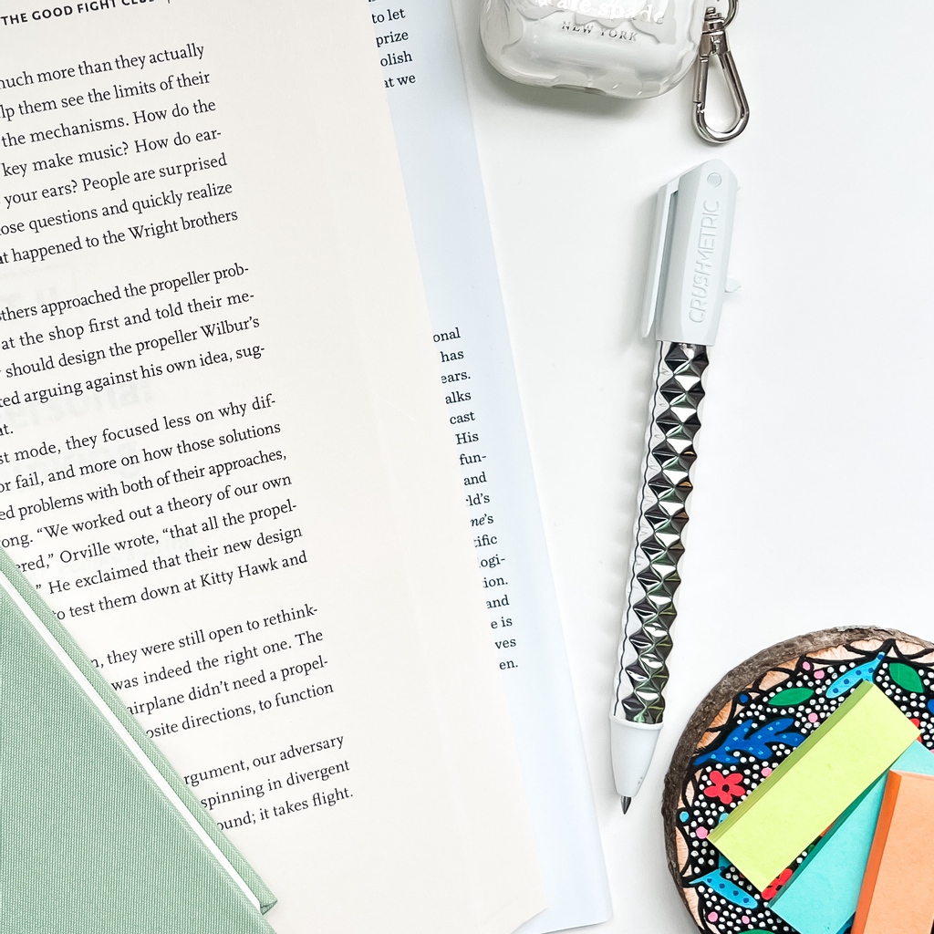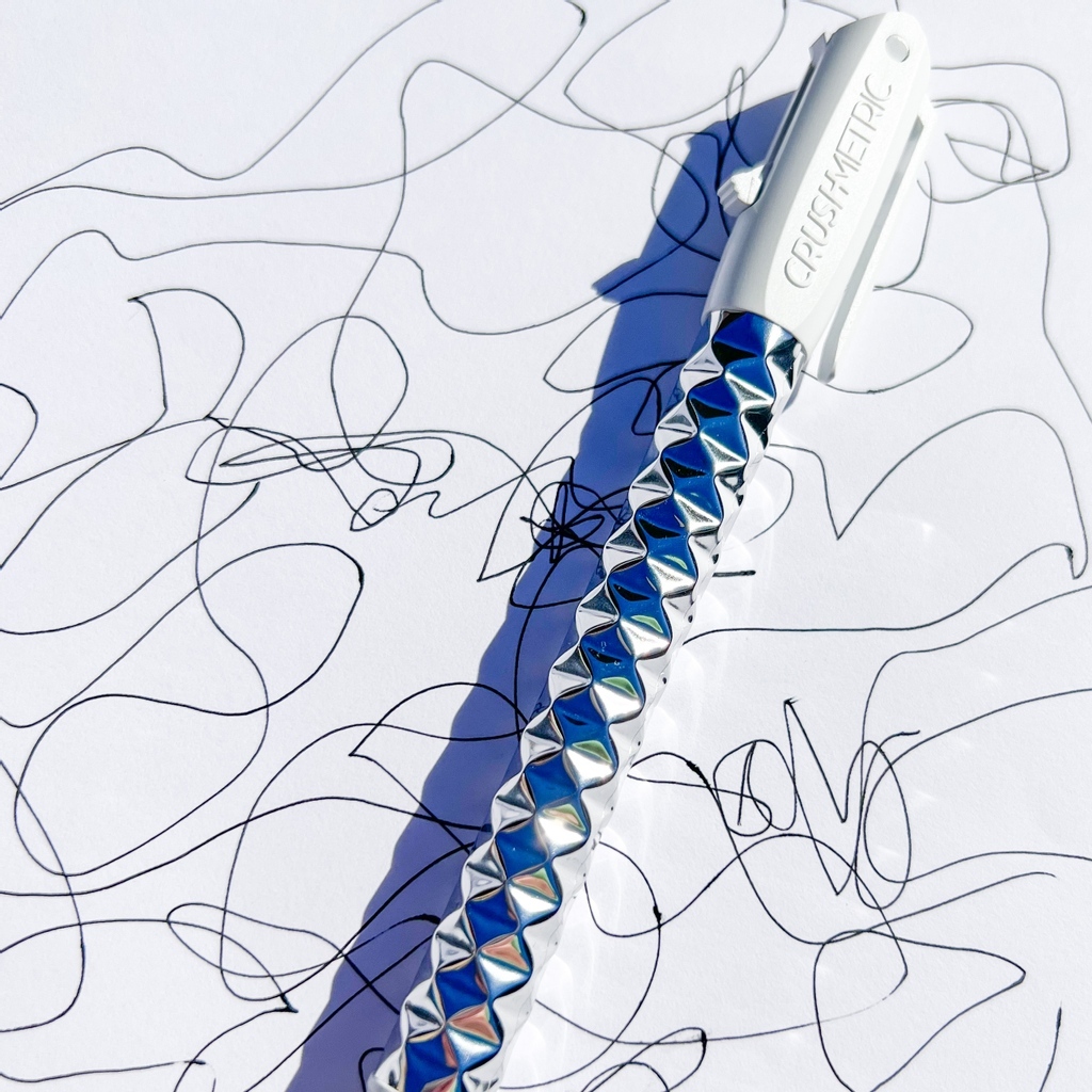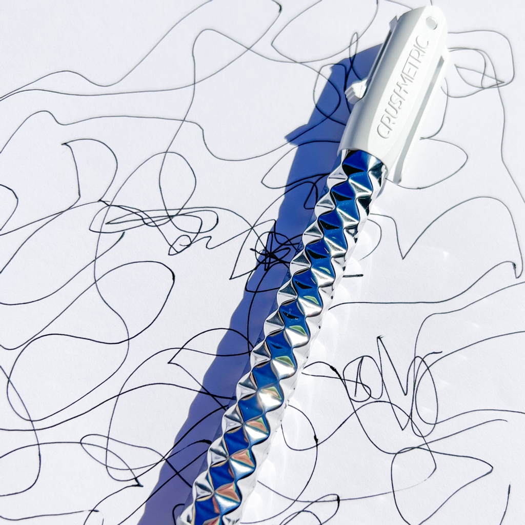 Retractable ballpoint pen with shape-changing body. Switches seamlessly between solid/crushed. Operates by switch that activates crushed grip and ink cartridge.